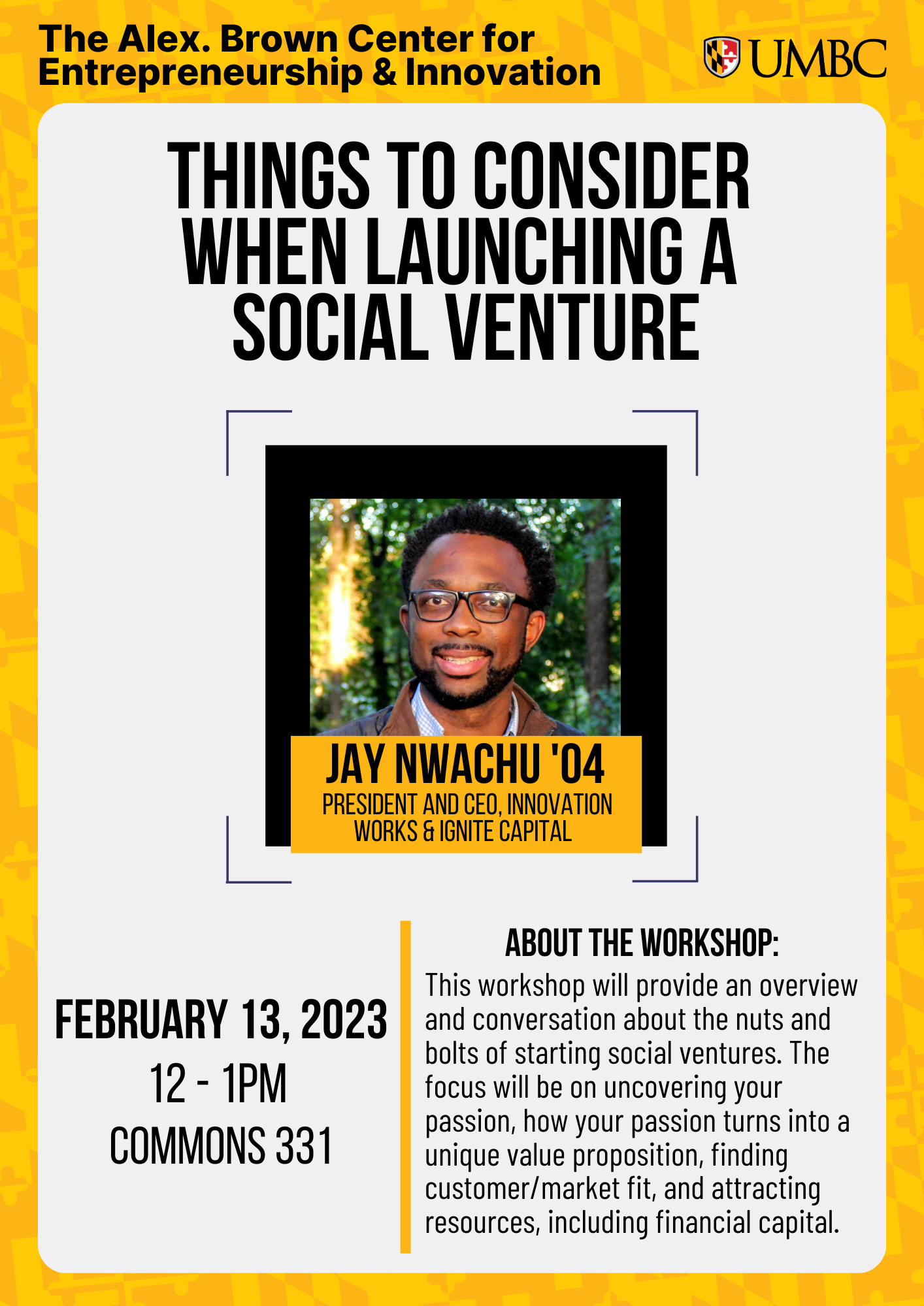 This event will feature Jay Nwachu '04, who is the President and CEO of Innovation Works & Ignite Capital. During his presentation titled, "Things to Consider When Launching a Social Venture", Jay will discuss how to uncover your passion, how your passion can be turned into a unique value proposition, and so much more! Students, faculty, alumni, and members of the business community are welcome to attend! FREE snacks will be provided!