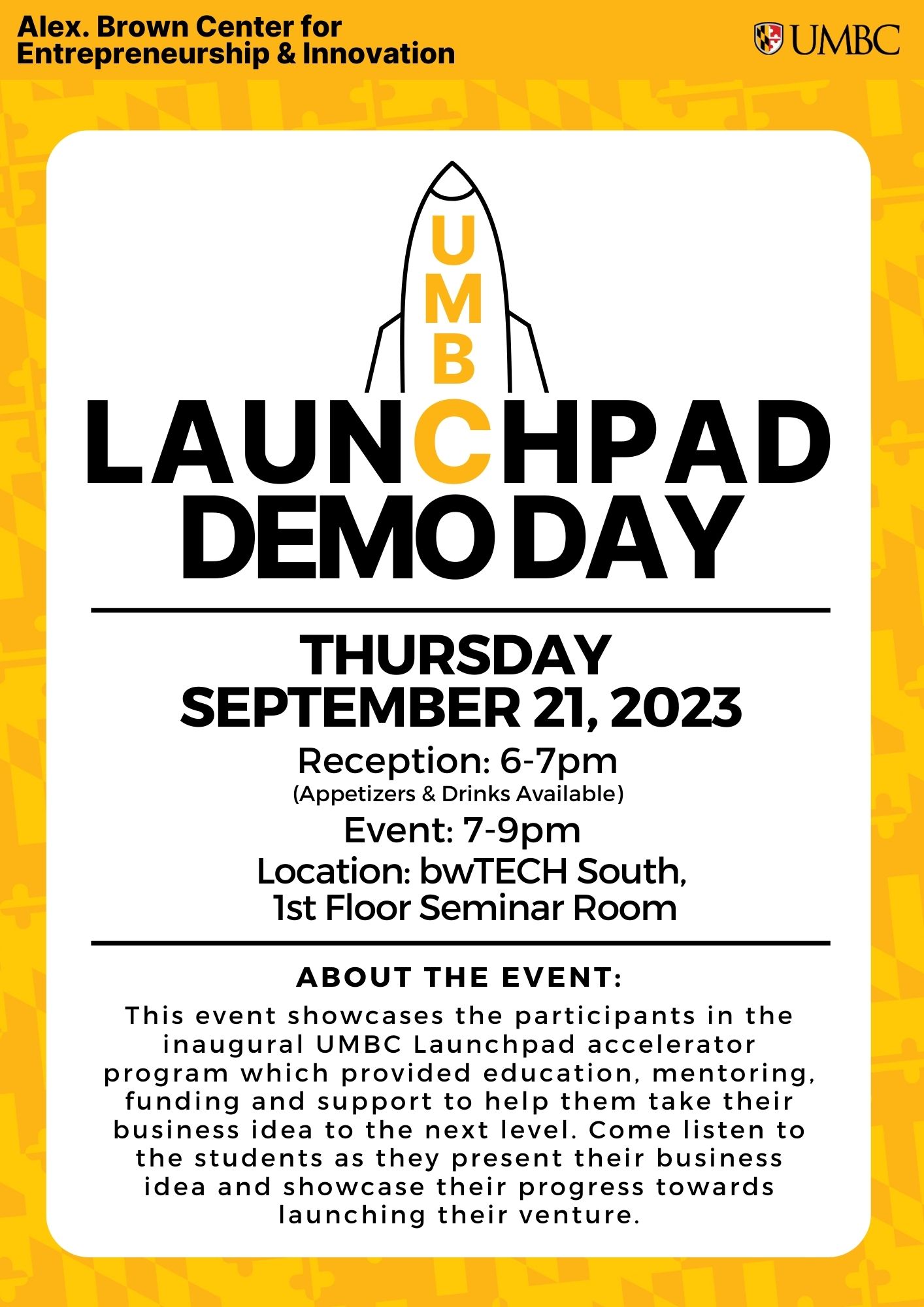 This event showcases the participants in the inaugural UMBC Launchpad accelerator program which provided education, mentoring, funding and support to help them take their business idea to the next level. Come listen to the students as they present their business idea and showcase their progress towards launching their venture.