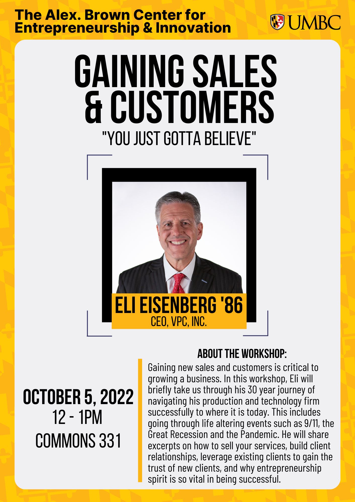 This event will feature Eli Eisenberg ‘86, who is the CEO of VPC, Inc. During his presentation title Gaining Sales & Customers: You Just Gotta Believe, Eli will share about how to sell your services, build client relationships, leverage existing clients to gain the trust of new clients, and explain why entrepreneurship spirit is so vital in being successful.